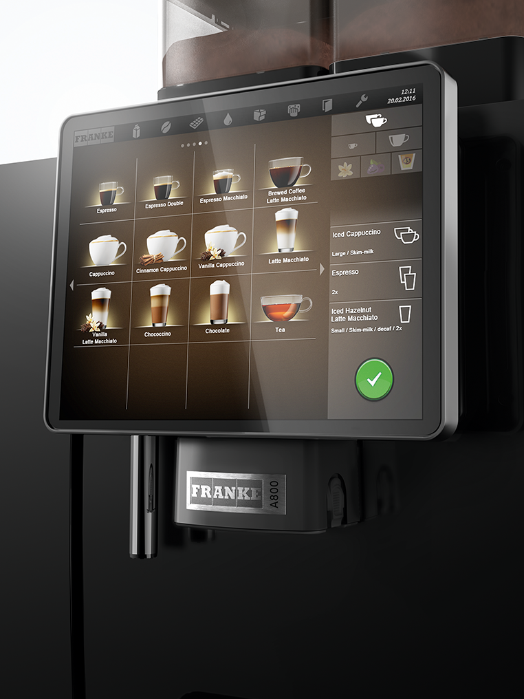 Samoposluživanje omogućuje Vašim gostima odabir napitaka kroz atraktivan menu. Jednostavnim dodirima i povlačenjem prsta po zaslonu lako naruče napitak, odaberu veličinu napitka i po želji dodaju aromu. Nakon toga se A800 ”baca na posao”.